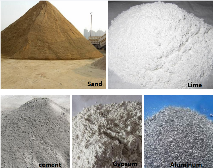 Sand or fly ash; lime; gypsum; aluminum powder; cementMatière première de brique