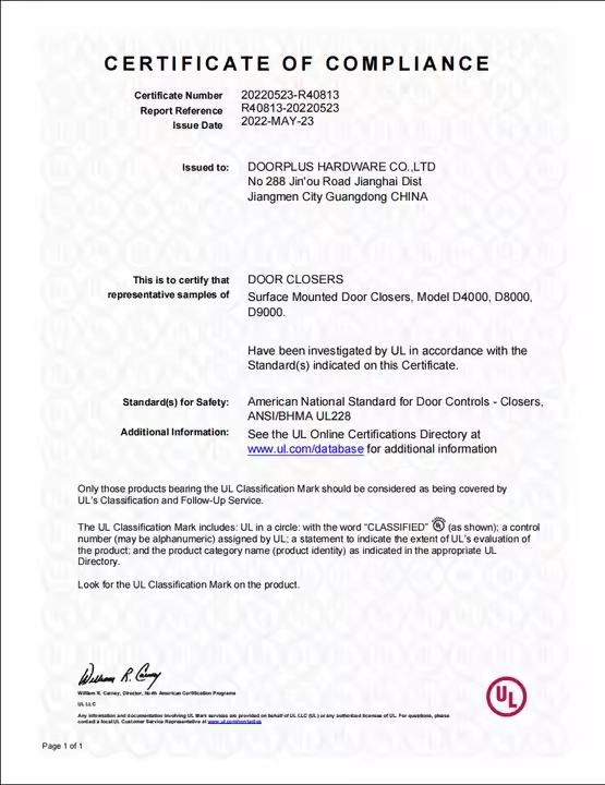 Doorpuls Design moderne pour ferme-porte automatique à usage intensif en alliage d'aluminium ferme-porte automatique à fermeture automatique UL coupe-feu