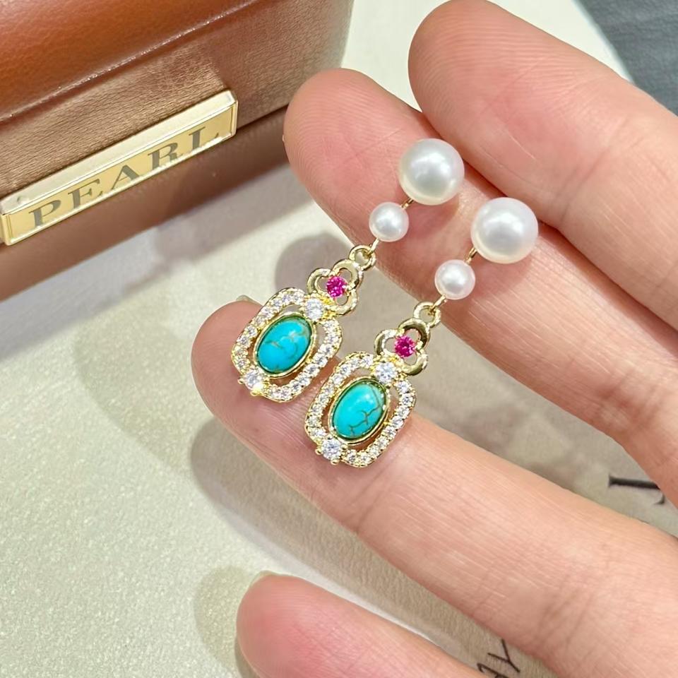 Boucles d'oreilles pendantes rétro en turquoise dégradé à double perle, bijoux en eau douce naturelle, tendance et élégante