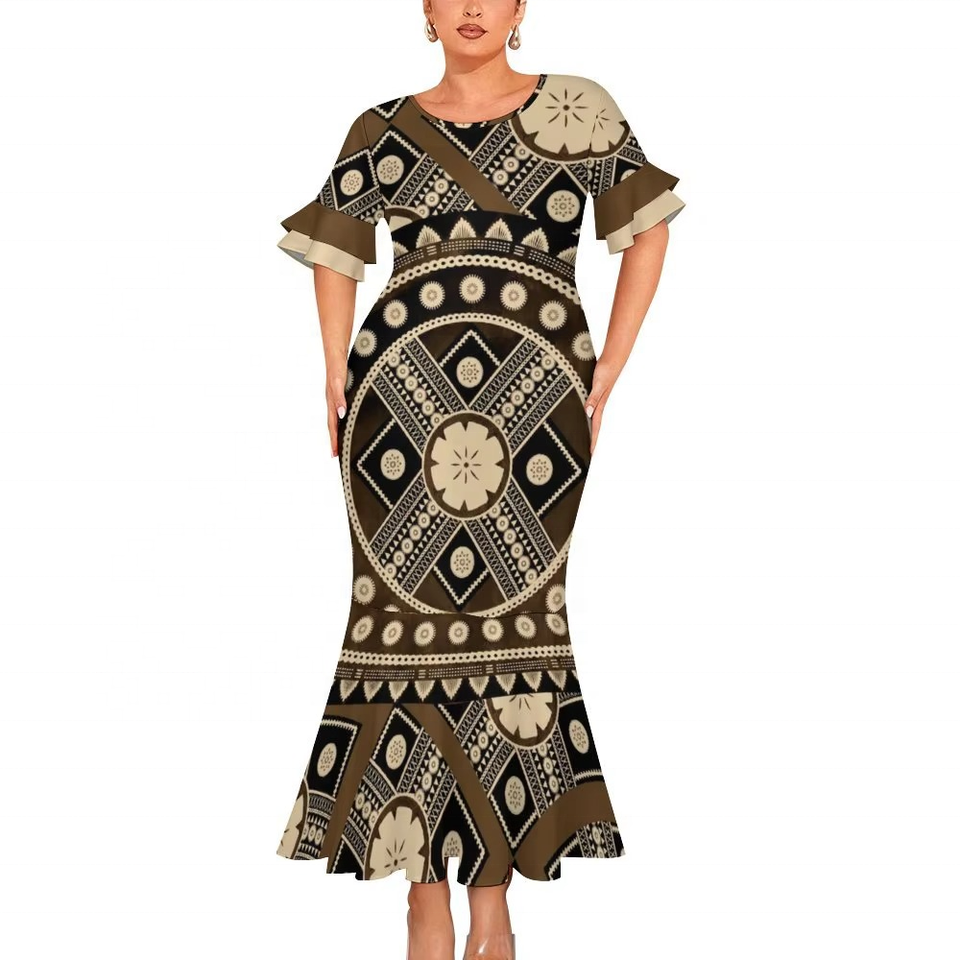 Robe sirène à double revers et col rond, motif tribal polynésien et samoan personnalisé de haute qualité