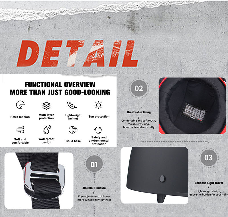 Casque de moto ABS demi-face style Double D avec doublure amovible, homologué DOT, nouveau modèle toutes saisons, antichoc et anti-UV