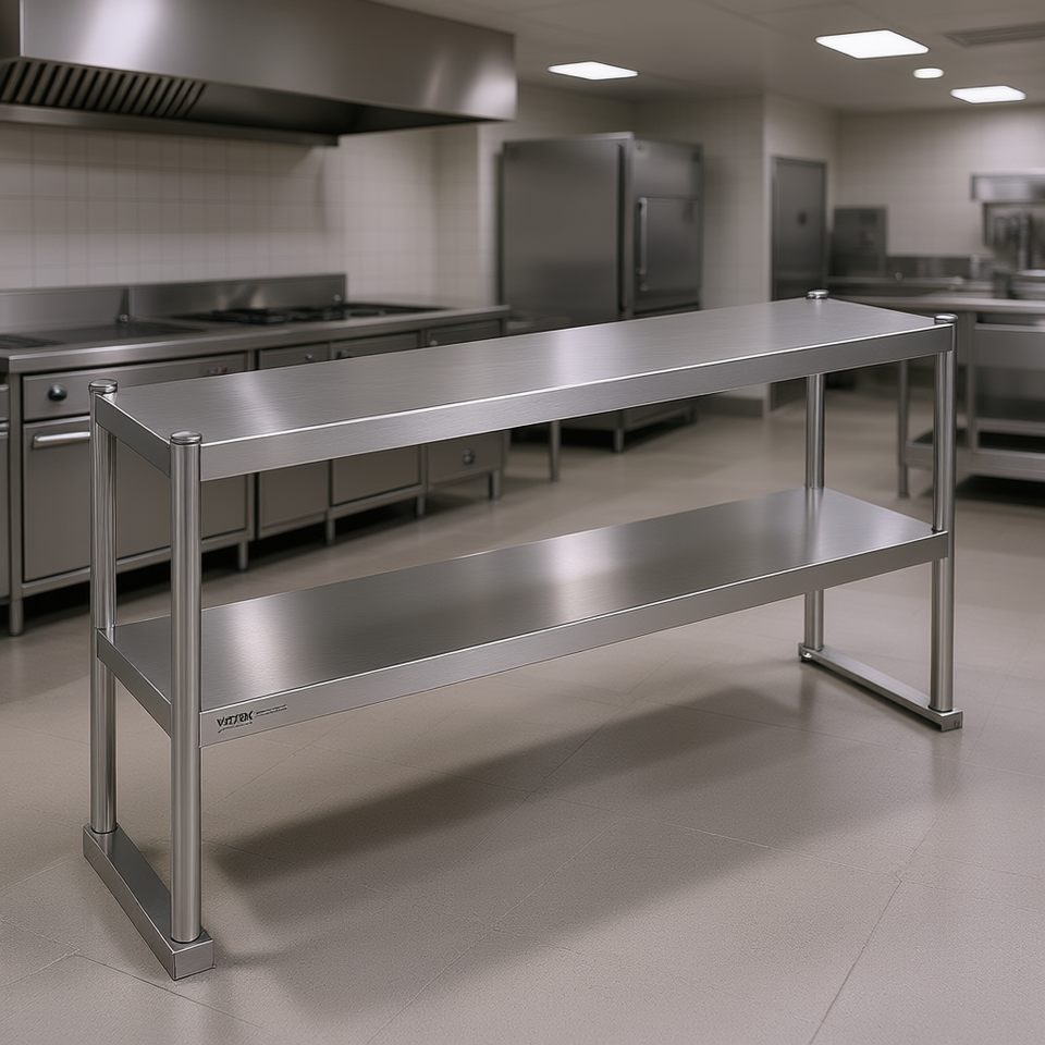 Table de préparation à double niveau Vevor, 12 x 48 pouces, en acier inoxydable, hauteur réglable, cuisine commerciale, fabrication en acier