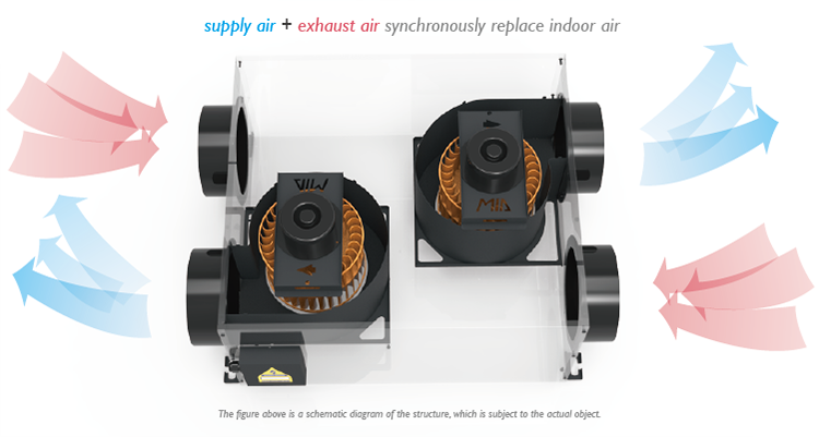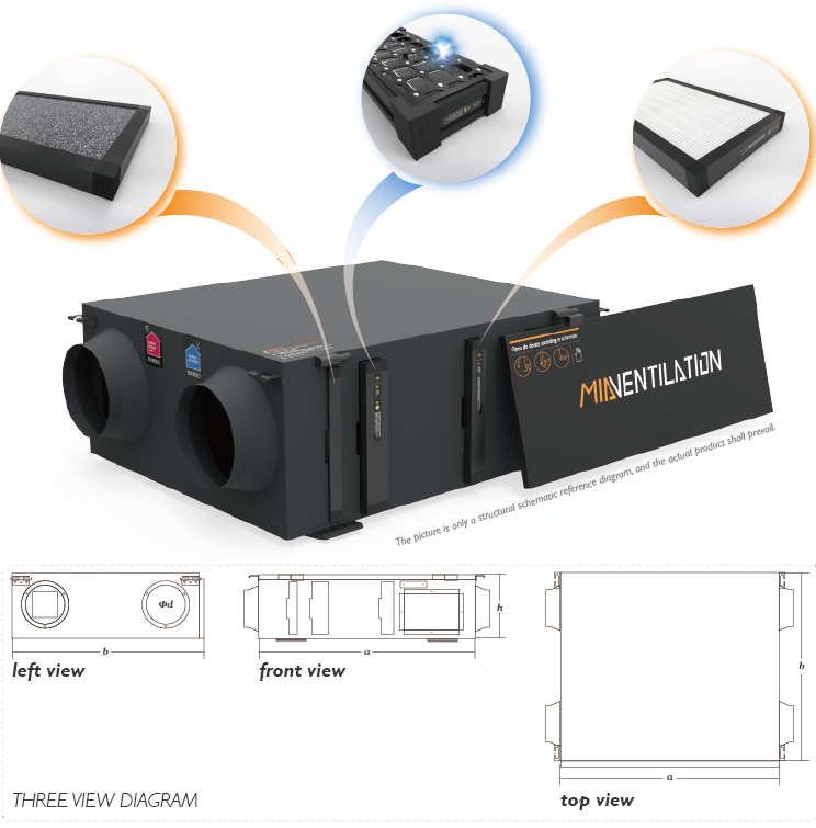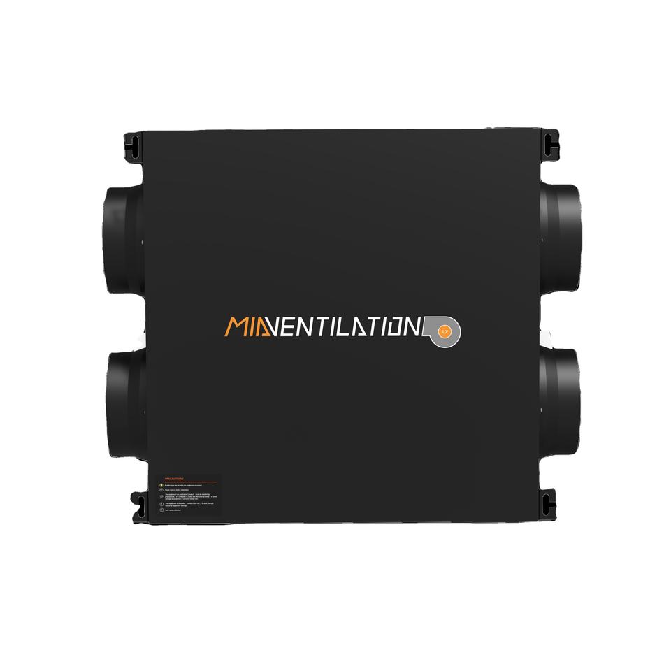 VMC à double flux pour usage hôtelier, marque MIA, modèle MIA-35SXL, débit d'air de 350 m3/h, fonctionnement silencieux à 29 dB, design du milieu du siècle