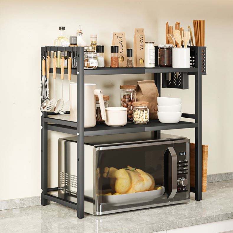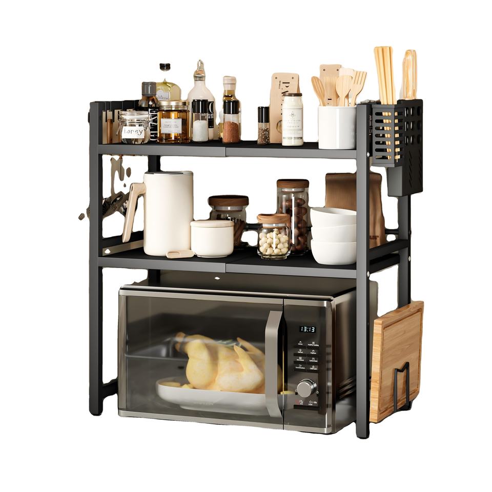 Étagère de cuisine rétractable en acier carbone double couche pour micro-ondes avec porte-couteaux et porte-baguettes