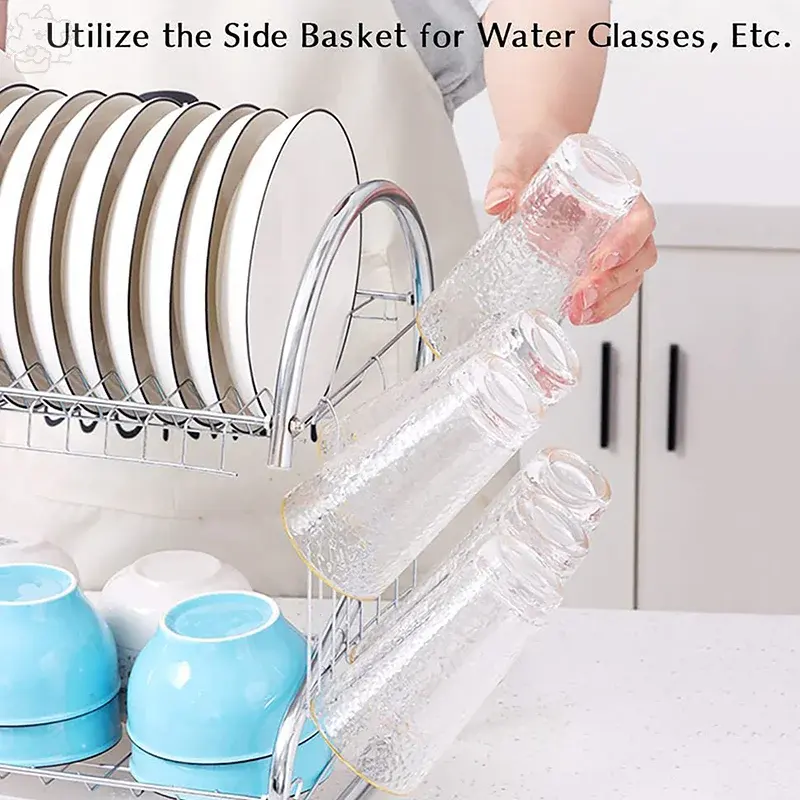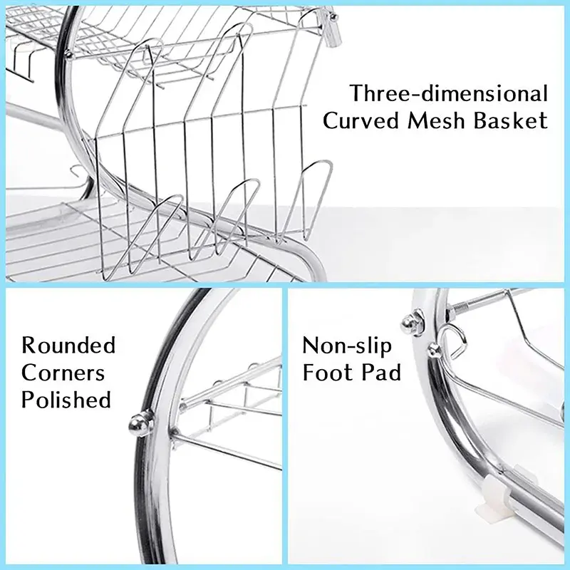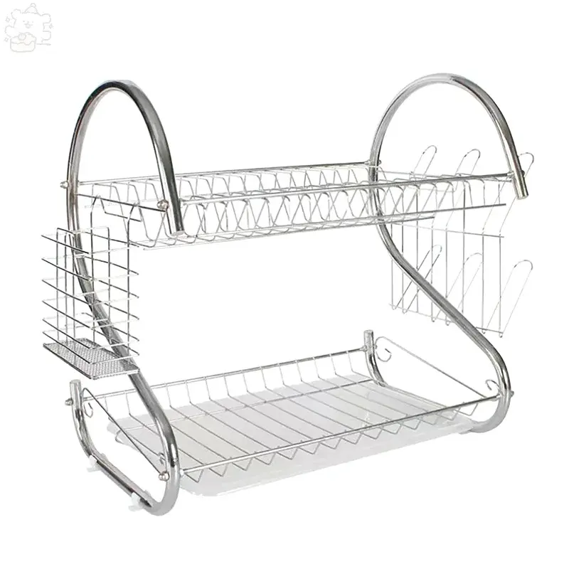 Double Layer S Shape Tube Dish Drainer Rack with Utensil Holder Drain Pan Kitchen Sink Drying Rack Organizer