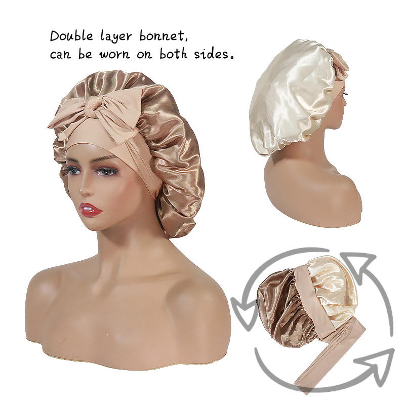 Bonnet de nuit en satin double couche avec bord large bonnet de douche en imitation soie extensible pour la beauté et les soins personnels