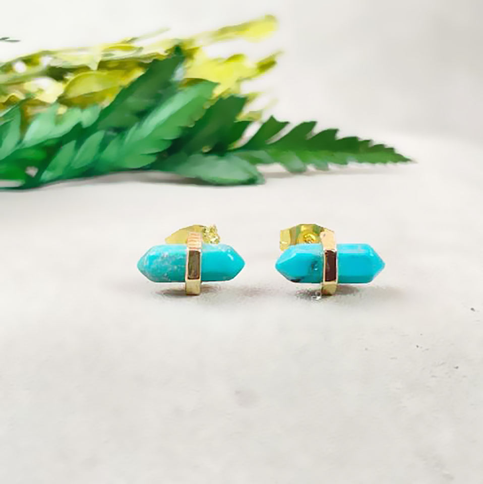 Boucles d'oreilles à double pointe en pierre précieuse turquoise 11x5mm en argent sterling 925 | Boucles d'oreilles plaquées or pour femmes, vente en gros