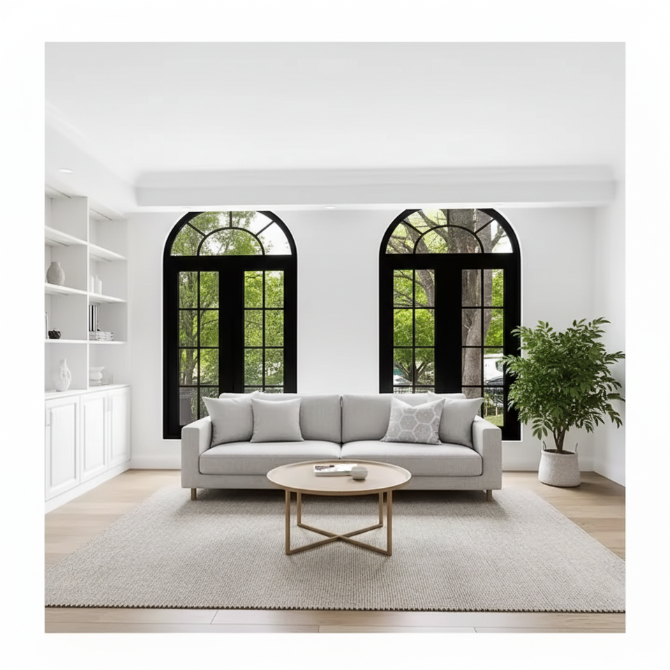 Fenêtres à double et triple vitrage, grande fenêtre arquée noire, fenêtre panoramique, fenêtre fixe du sol au plafond, fenêtres arquées en aluminium