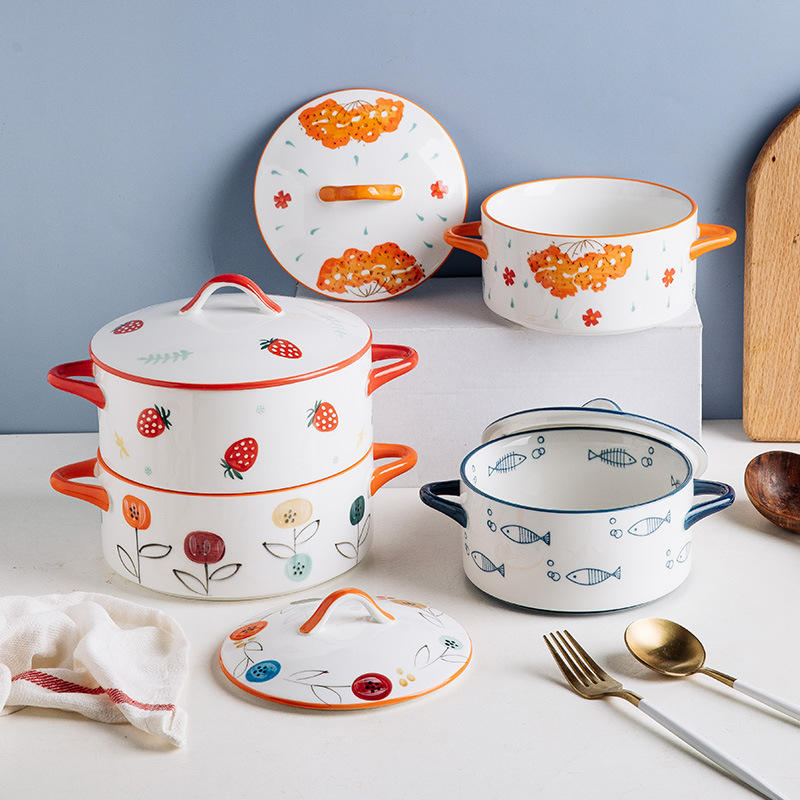 Bol à soupe à double oreille, bol à nouilles instantanées couvert de céramique, dortoir pour étudiants