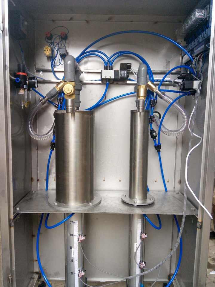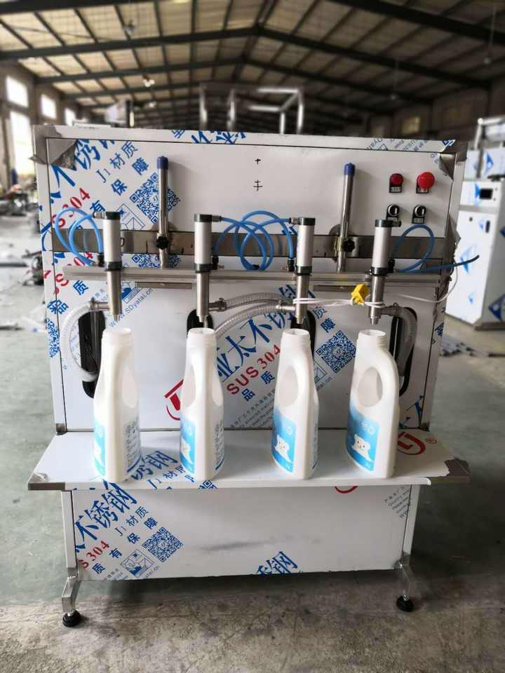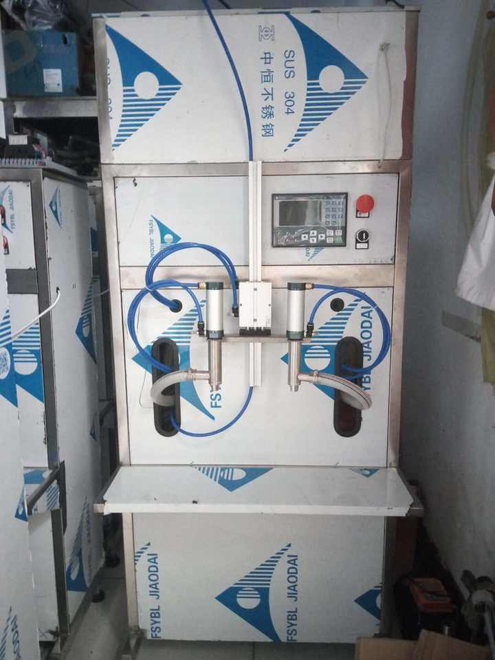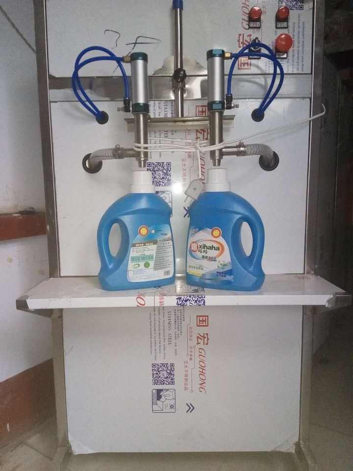 Machine de remplissage semi-automatique à double embout pour liquides visqueux, capacité de remplissage de 1 à 5 litres.