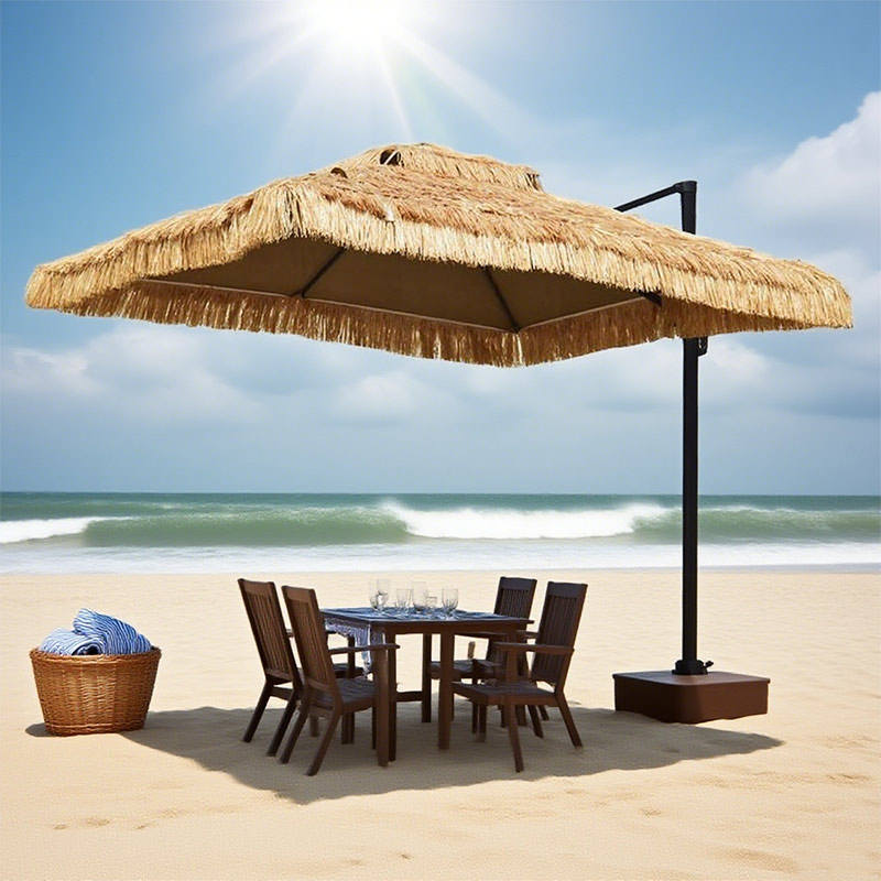 Parasol de plage imperméable à double couche avec cadre en fer et design romain en paille pour la plage et l'hôtel