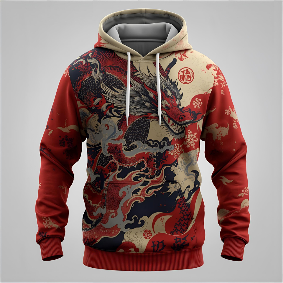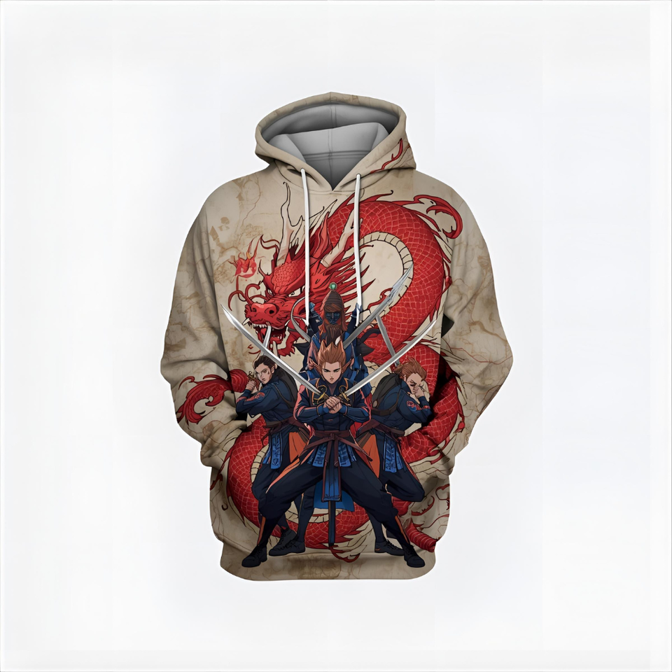 Dragon Swordsmen Printed Hoodie Cotton Fleece Pullover Sweatshirt with Custom Graphic Design and OEM Customized order welcome
