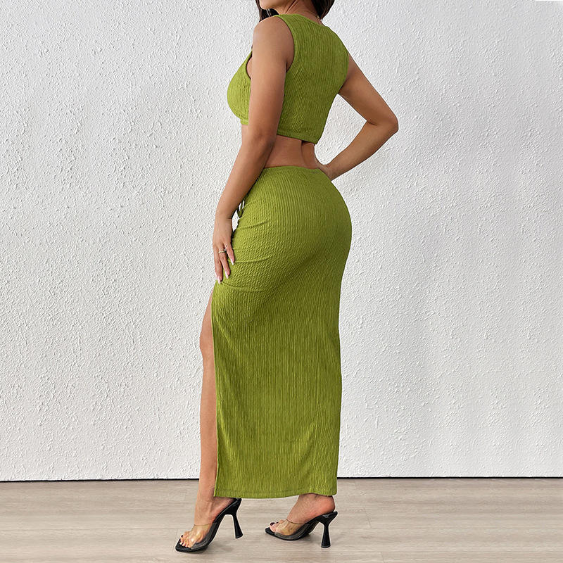Ensemble 2 pièces décontracté pour femme : Gilet sans manches effet plissé et jupe fendue – Tendance