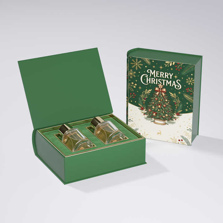 Personnalisation sur base de dessin, emballage de parfum de Noël, boîte cadeau de luxe de style livre avec insert en EVA