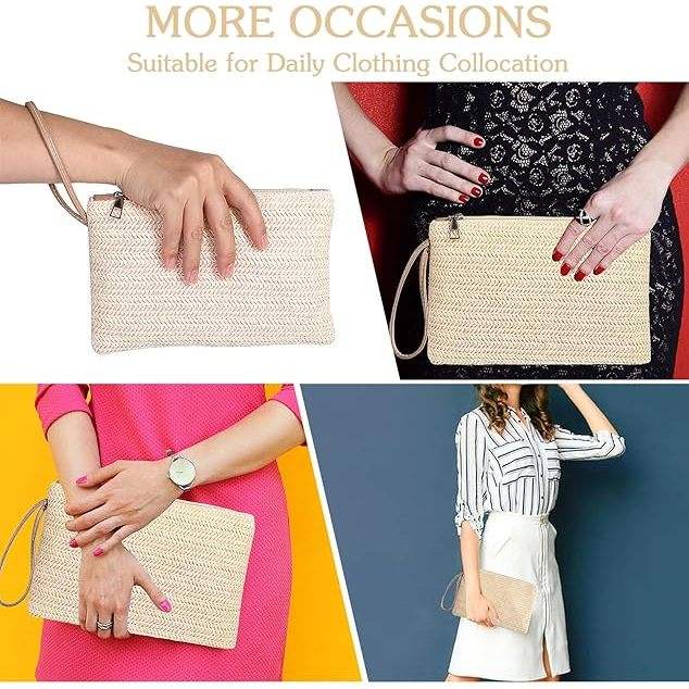 Sac à main tissé bohème d'été DreamCraft pour femmes et filles, pochette en paille fabriquée au Vietnam avec fermeture éclair et dragonne