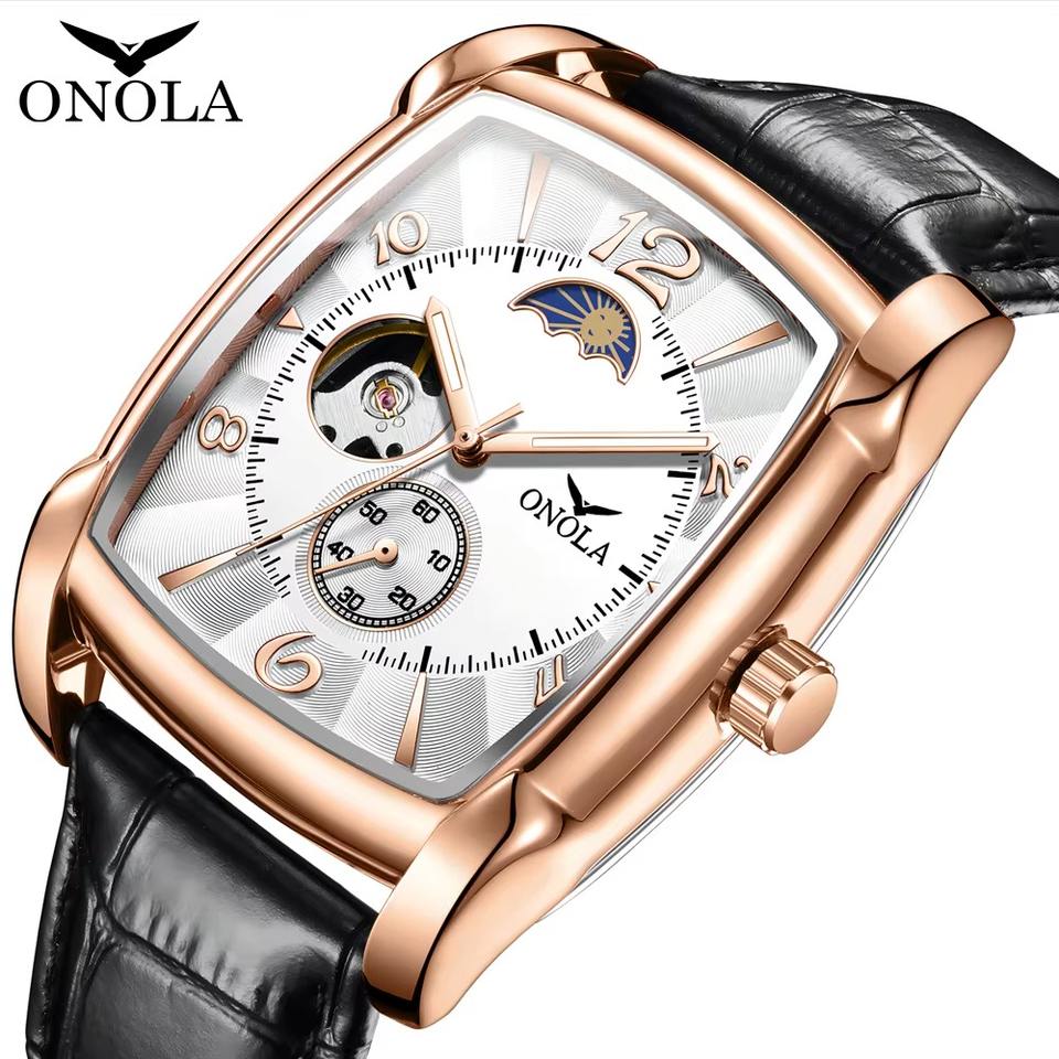 Montre Homme Carrée Drioshipping ONOLA Décontractée à Cadran Creux et Volant d'Hélice, Étanche, Mécanique, Bracelet en Cuir ON6848