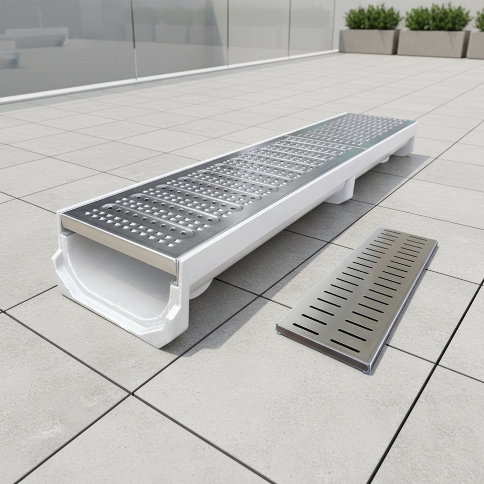 Caniveau de drainage souterrain U300-300 pour allée, canal de drainage en résine et béton avec couvercle en acier inoxydable