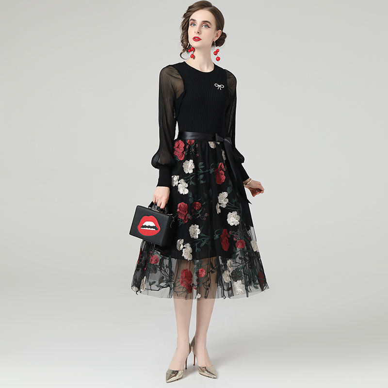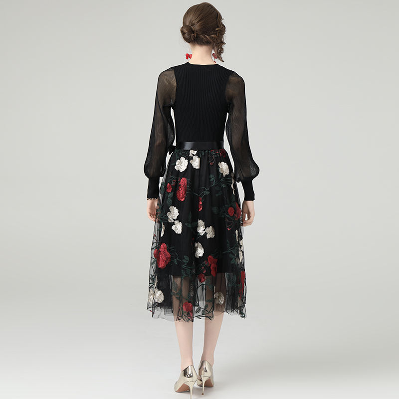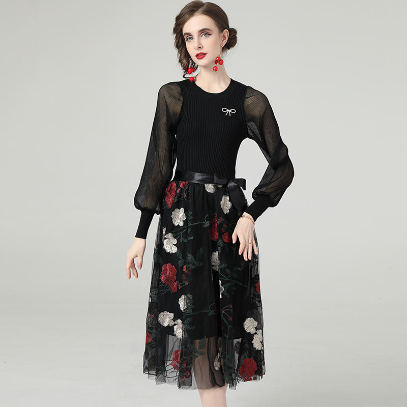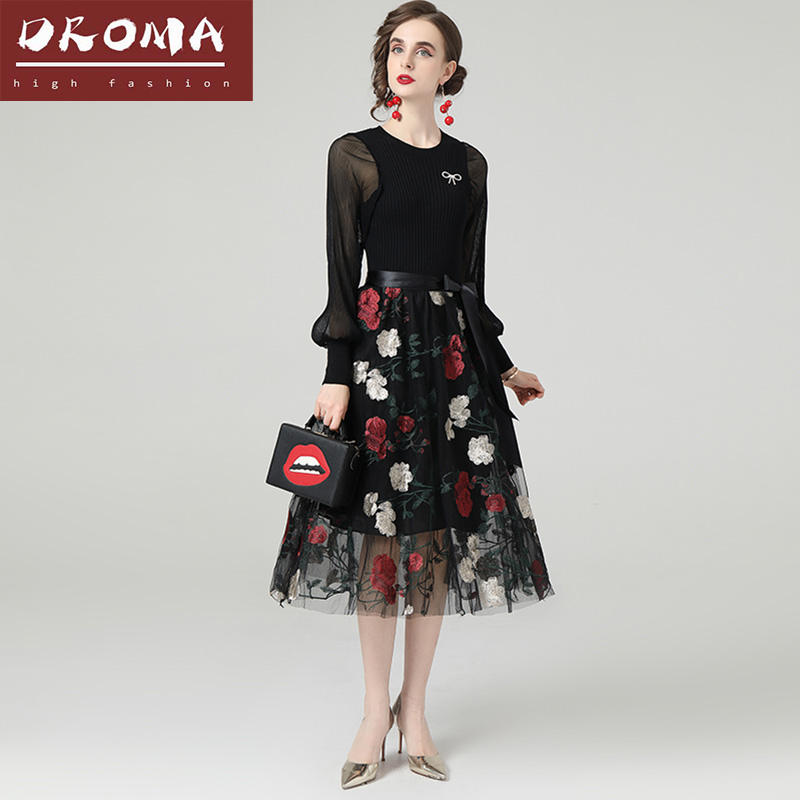 Droma 2021 French Style Long-sleeved Knitted Stitching Embroidery Floral Mesh Midi Dress