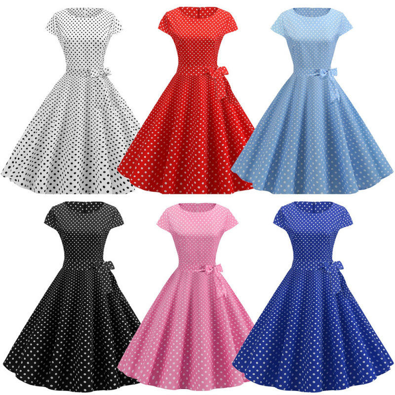 Drop Ship Rouge Rose Polka Dot Vintage Summer Dresses Femme 2023 New Short Sleeve Midi Party Sundress A-Line Vestidos Femininos