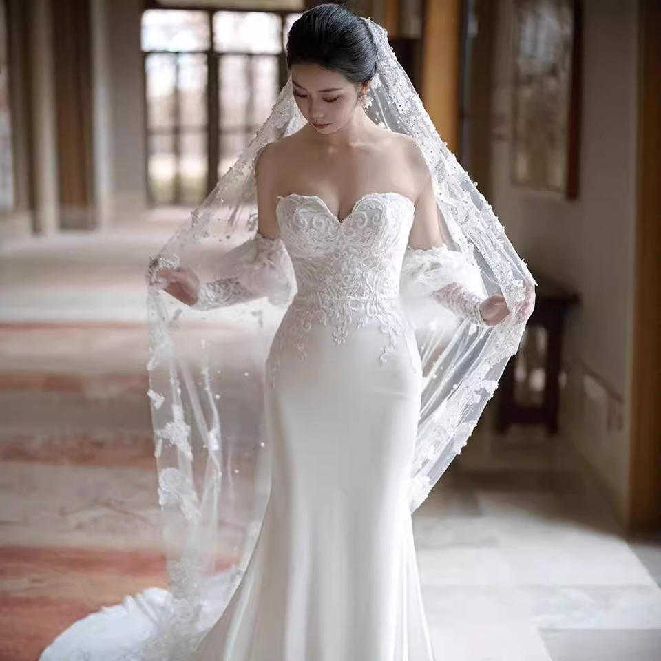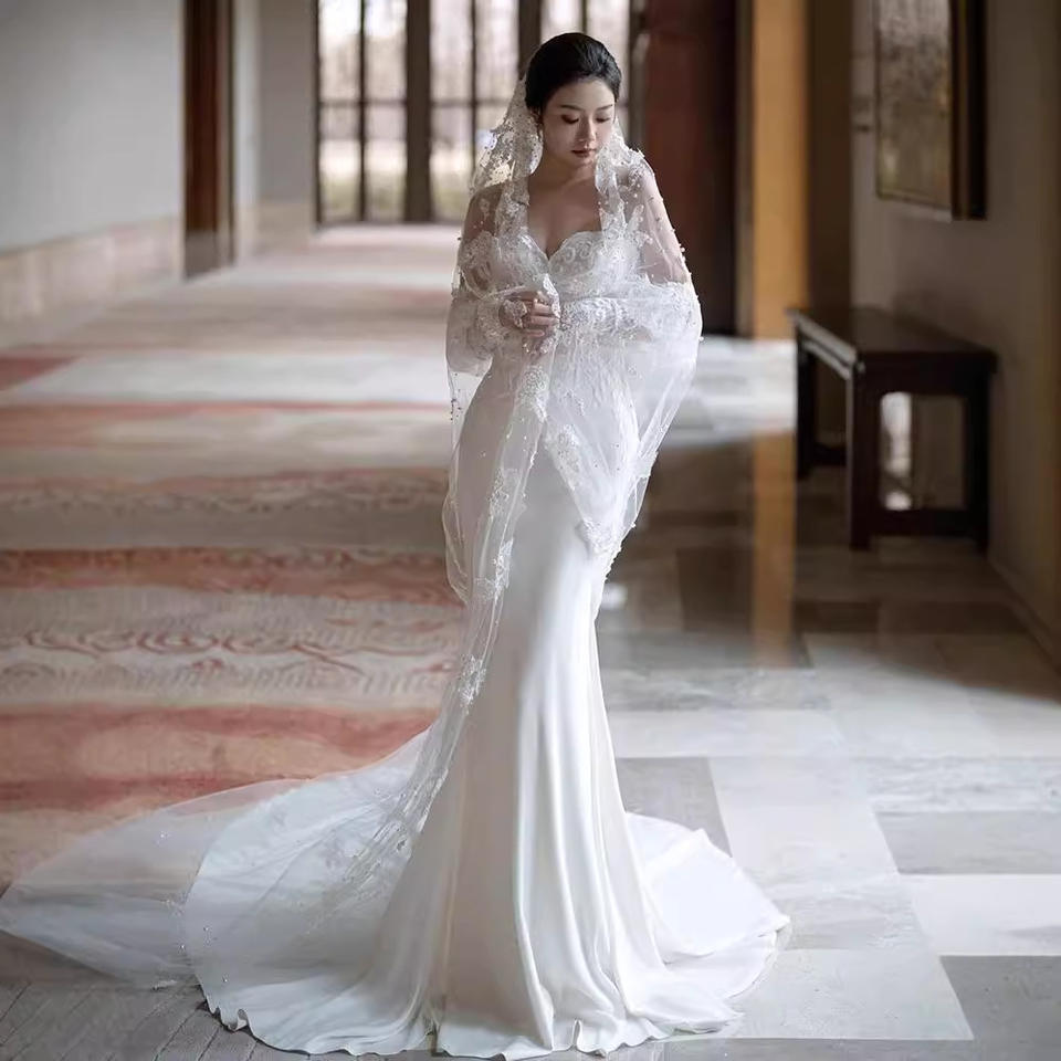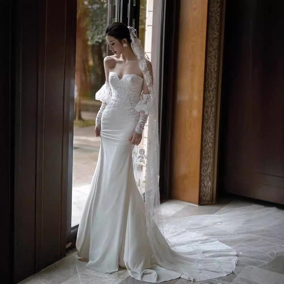 Drop Shipping 2025 Nouveau modèle Satin de sirène Robe de mariée de voyage à la française pour femmes Élégant Rétro Robe de mariée principale sans bretelles Voiles de mariée