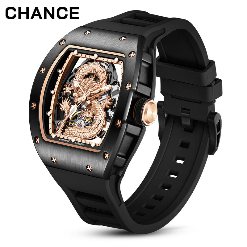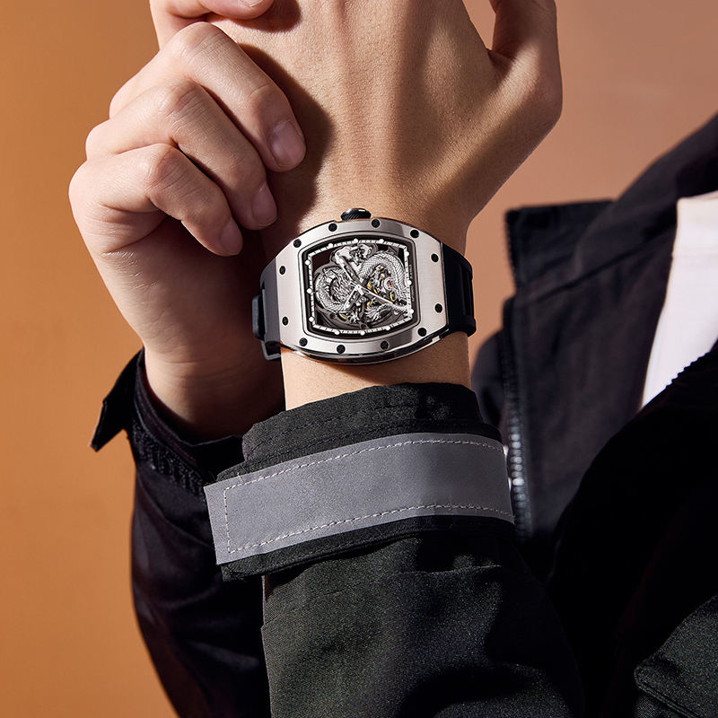 Montre mécanique automatique de luxe pour le dropshipping, étanche, lumineuse, cadran dragon, personnalisable, style business décontracté, en fibre de carbone
