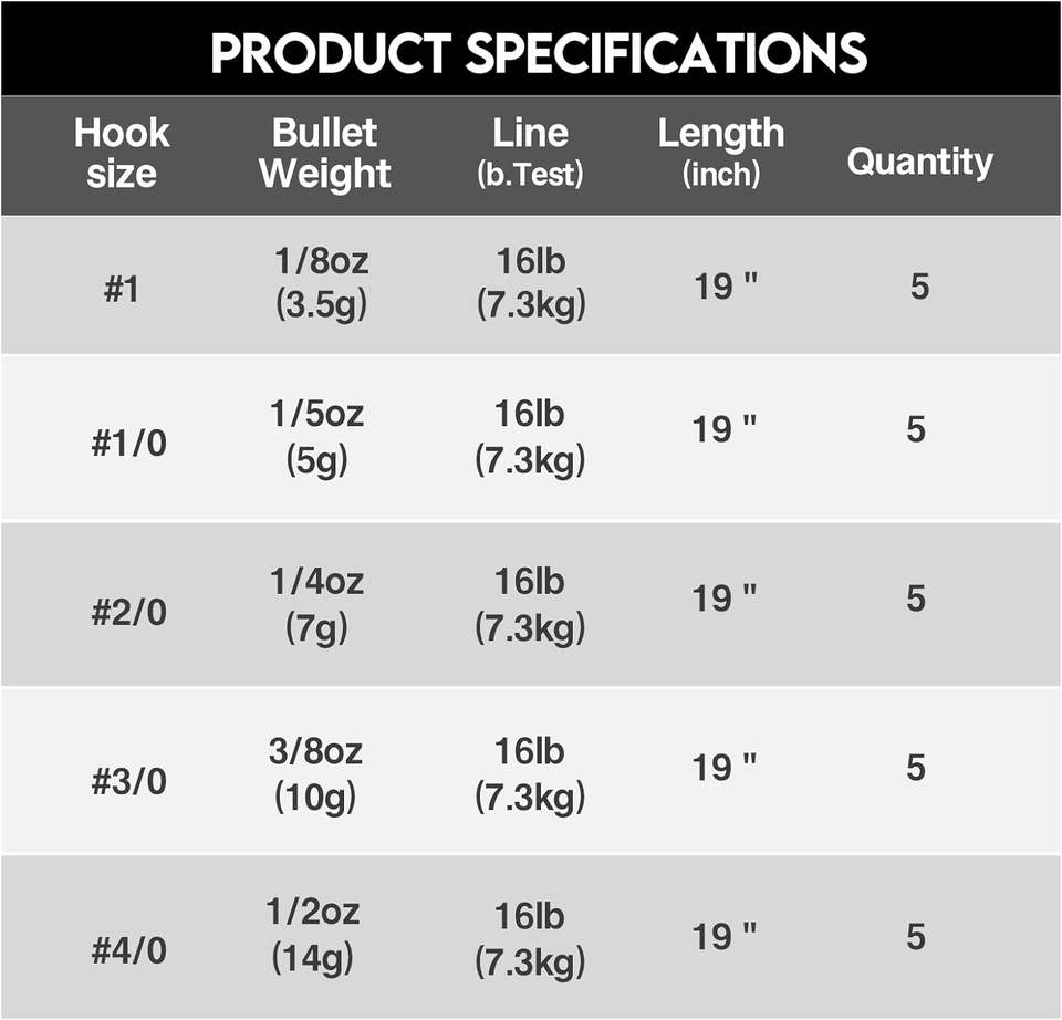 #1-1/8oz; #1/0-1/5oz; #2-1/4oz; #2/0-3/8oz; #3/0-1/4oz