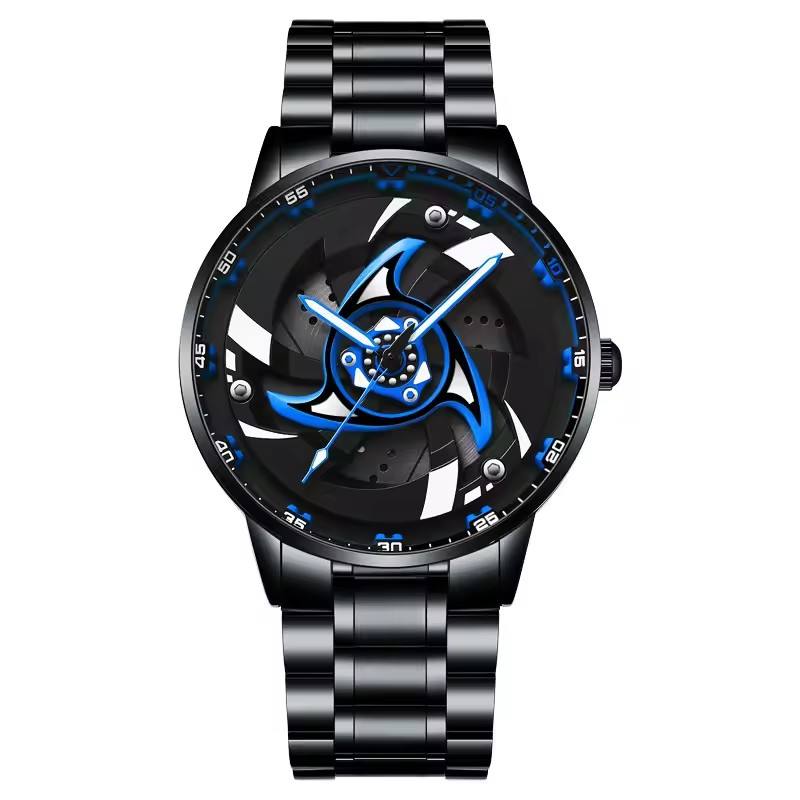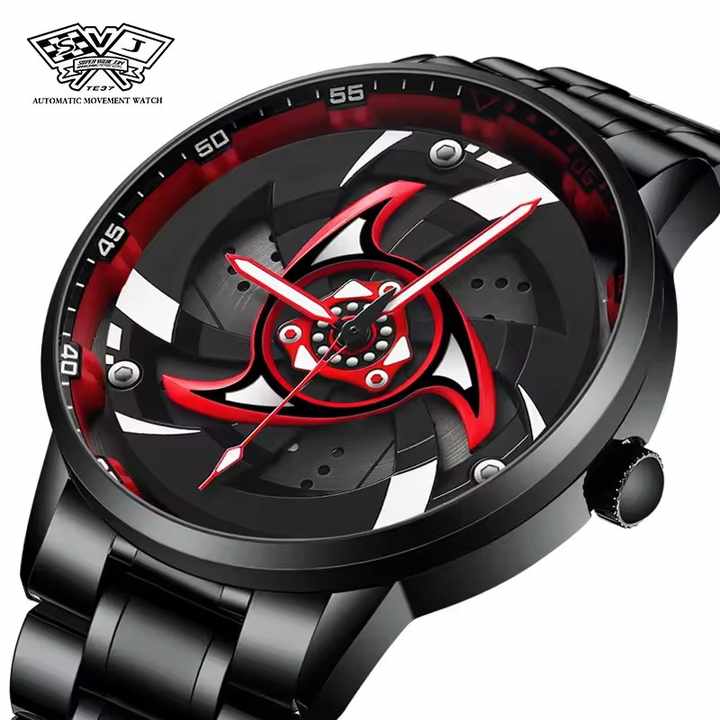Montre-bracelet de sport créative à mouvement à quartz rotatif, série automobile, 42 mm, en acier inoxydable noir, idéale pour le dropshipping et comme cadeau