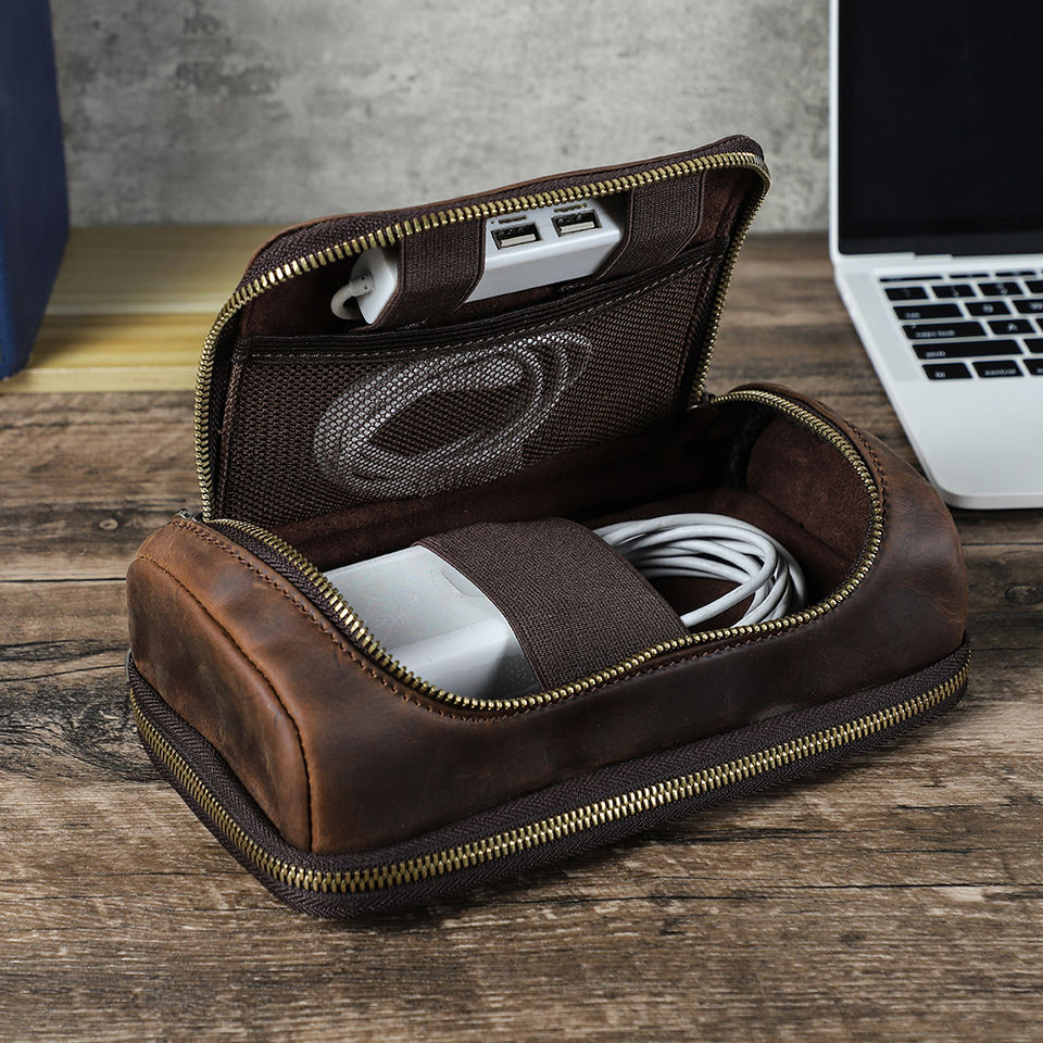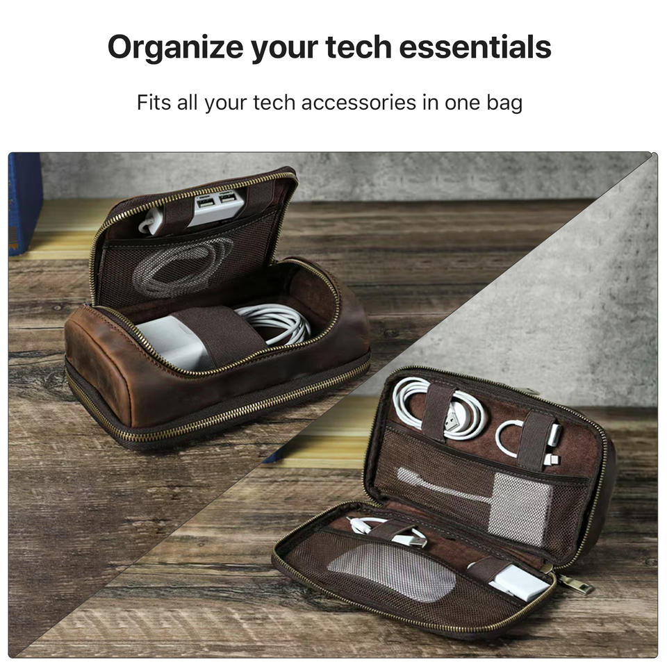 Sac de rangement pour câbles de voyage en cuir personnalisé, fait main, avec double fermeture éclair, pochette technique portable pour accessoires électroniques