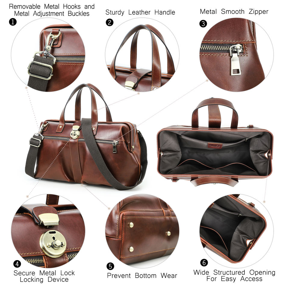 Sac de Médecin en Cuir Pleine Fleur Pull-Up pour Homme, avec Cadre Métallique Structuré, Porte-Ordinateur Portable 14'' et Sangle Amovible à Fermeture Push-Lock