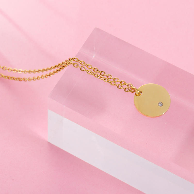 Dropshipping Collier rond avec logo gravé personnalisé Pendentif pièce de monnaie disque vierge pavé plaqué or 18 carats Bijoux tendance en acier inoxydable