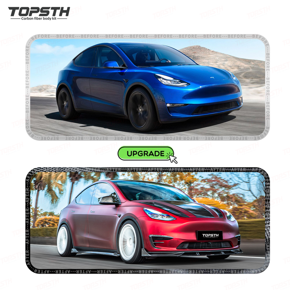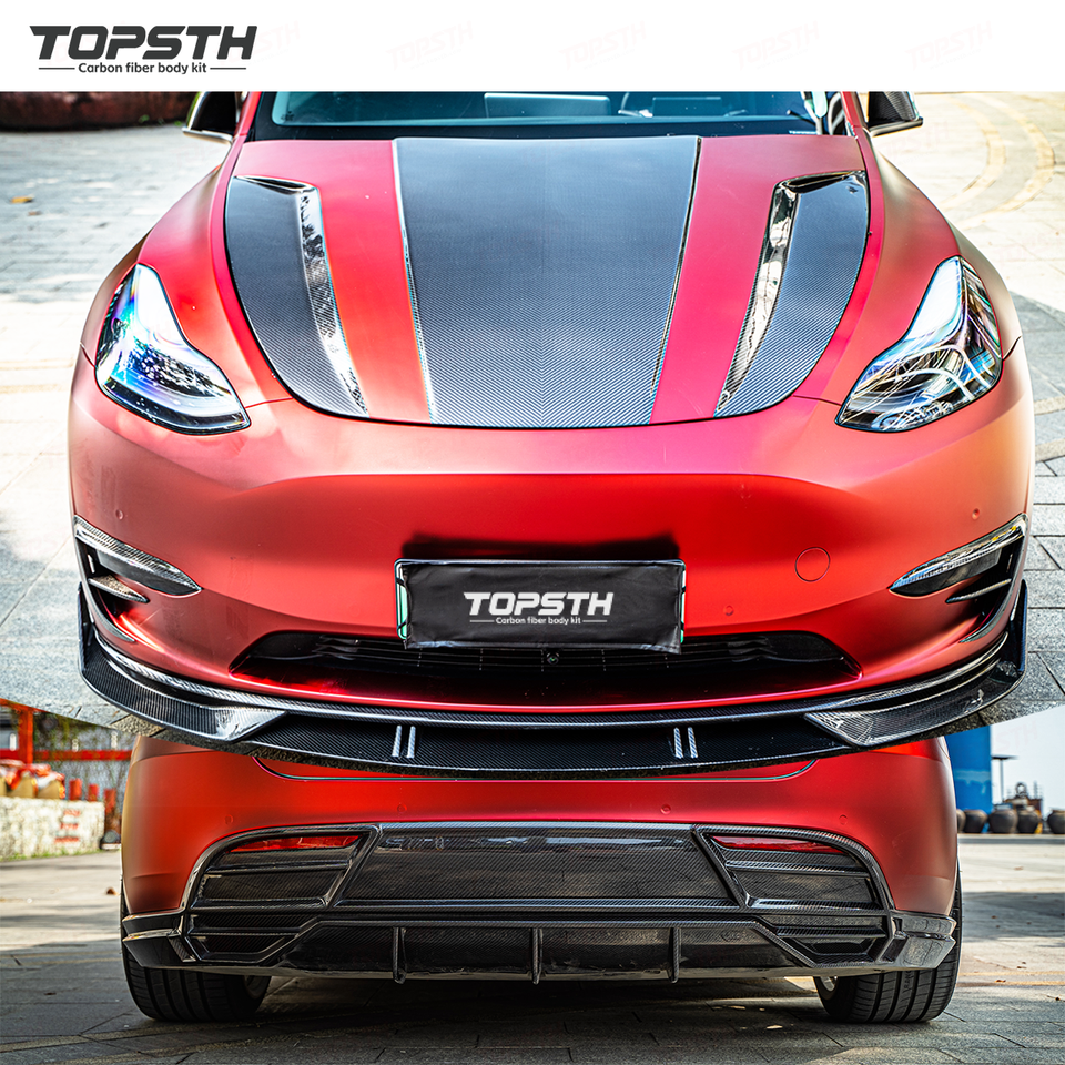 Kit carrosserie en fibre de carbone sèche pour Tesla Model Y 2021-2024 – Kit de mise à niveau extérieur complet : Lame avant, jupes latérales, diffuseur arrière, aileron