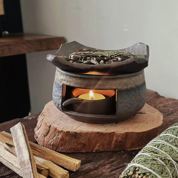 Poêle d'aromathérapie vintage en poterie artisanale cuite à sec, résistant à la chaleur, pour la maison et le bureau, avec bougies incluses, pour un thé chaud