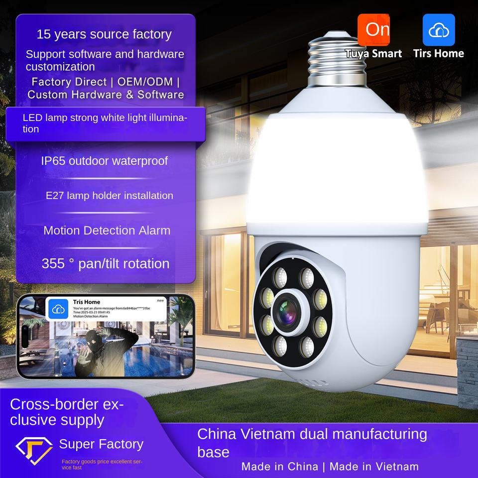 Caméra PTZ à double bande avec ampoule E27, projecteur, détection de mouvement, stockage de données sur carte mémoire, personnalisable pour une utilisation en extérieur et à domicile