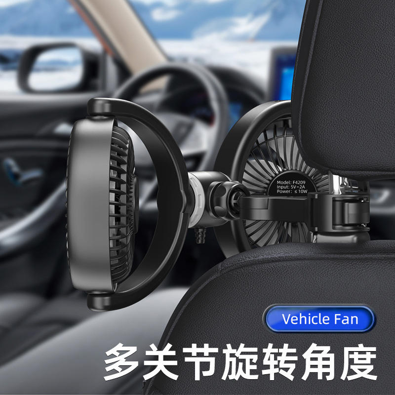 Ventilateur de voiture double tête F4209 USB 12V rechargeable, trois vitesses réglables pour le refroidissement des sièges arrière, en matériau ABS/PP, sous marque privée sous licence