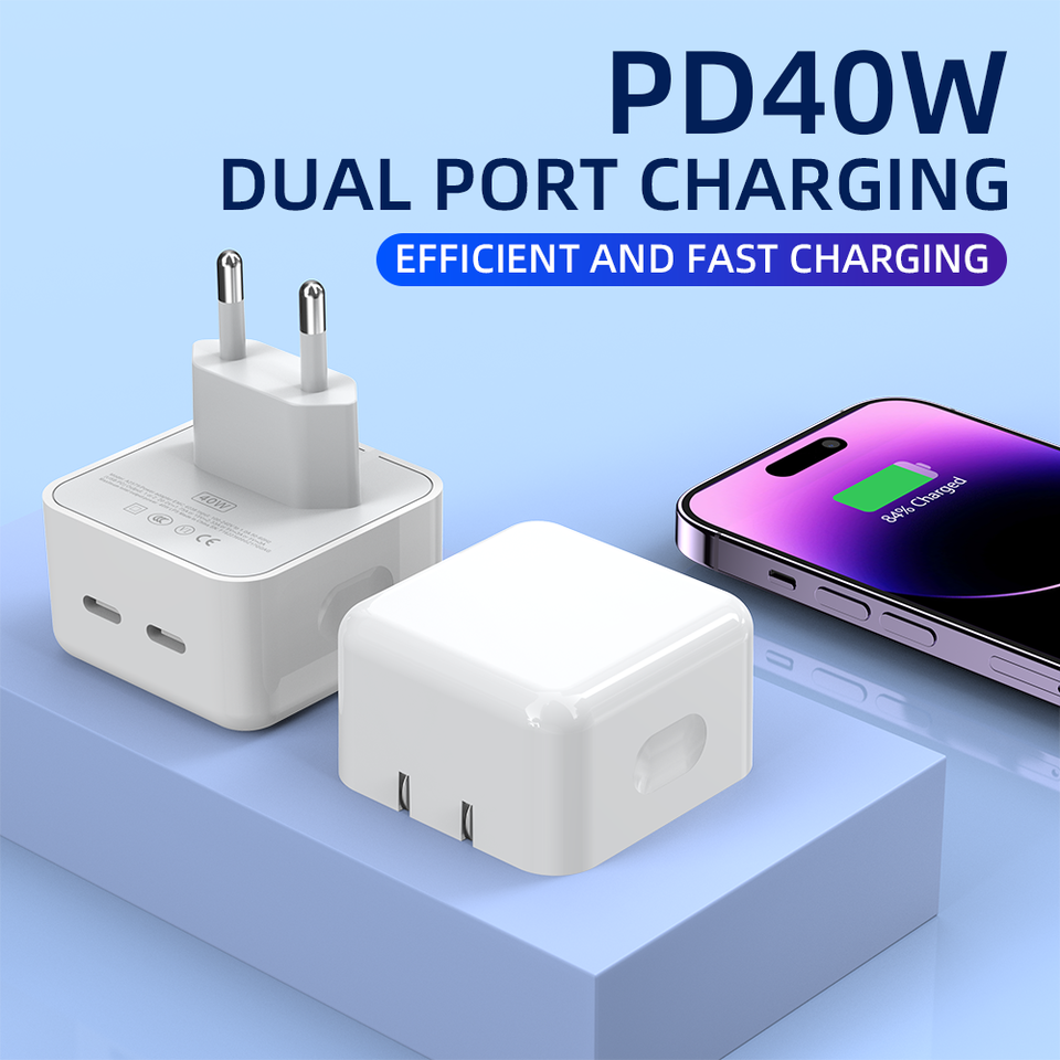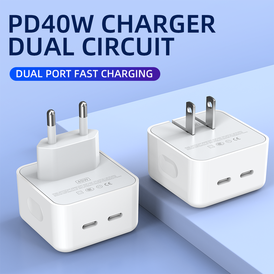 Chargeur mural double port 40W PD avec 2 ports USB-C, charge rapide 20W, prise US/EU pour téléphones mobiles