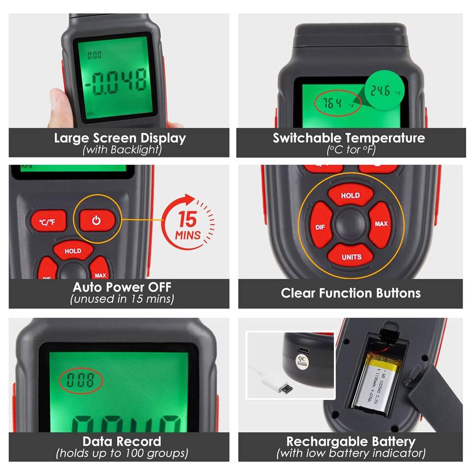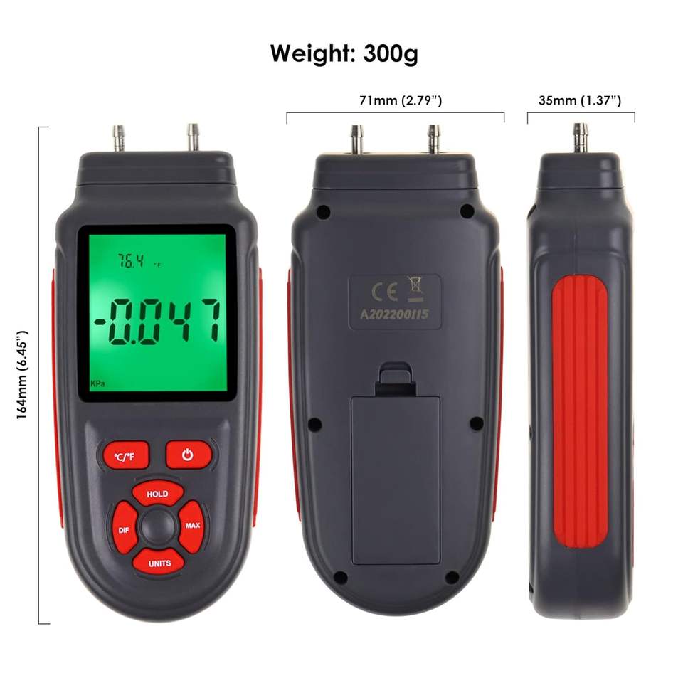 Manomètre numérique double port en acier inoxydable pour gaz et air, enregistrement des données, 12 unités, jauge différentielle CVC, grand écran rétroéclairé