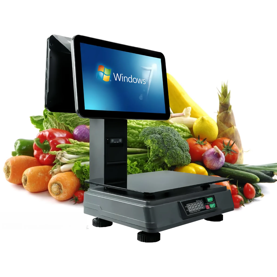 Système POS Android tout-en-un à double écran 15,6 pouces 10 points 1080p avec balance intégrée, écran tactile résistif, Wi-Fi 6, NFC, blanc