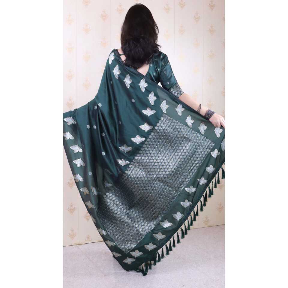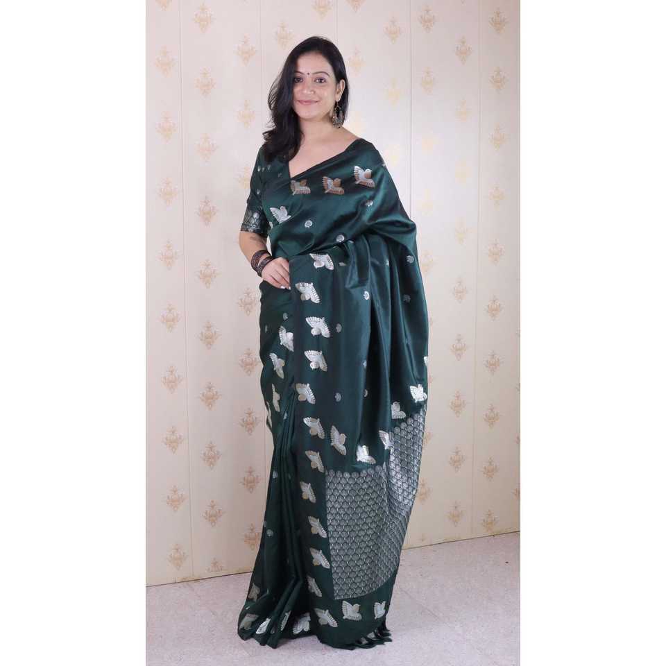 Dual Zari Woven Saree with Bird Border Bottle Green Soft Silk for Club Dressing