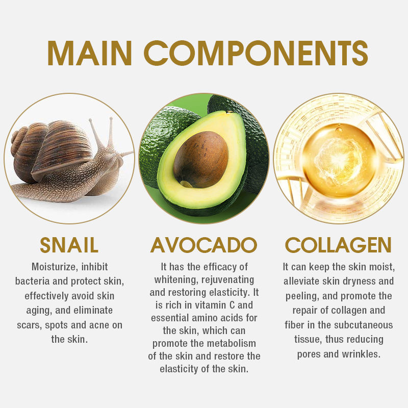 Hyaluronic Acid, Vitamin E, Collagen, Shea Butter, Squalane, Purslane, Snailsmain ingredient