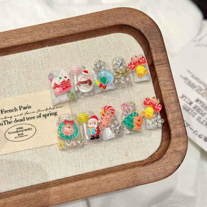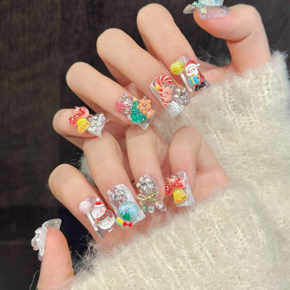 Ongles press-on en forme de bec de canard faits à la main, 3D, sapin de Noël, cloches, rennes mignons, cannes en sucre, nœuds, ongles artificiels