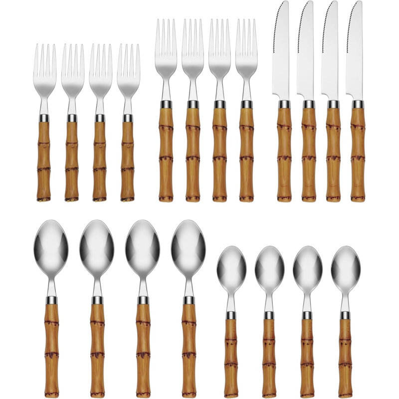 Durable 20-Piece Bamboo-Inspired Stainless Steel Flatware Set Dishwasher Safe and Mirror Polished for 4 People Eating Utensils
