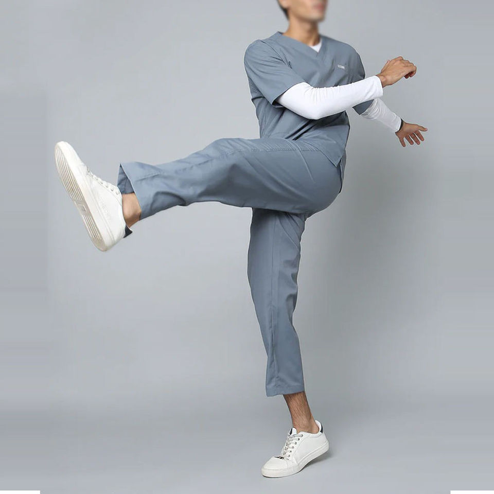 Tenue médicale homme durable extensible dans les quatre sens - Blouse anti-plis à col en V et pantalon droit - Vêtements de santé respirants