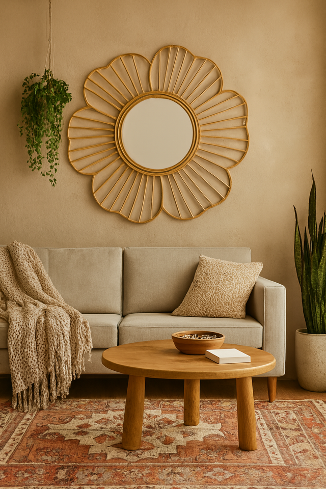 Miroir de salle de bain décoratif en rotin et bambou tissé à la main, durable, léger, écologique, design bohème en forme de soleil