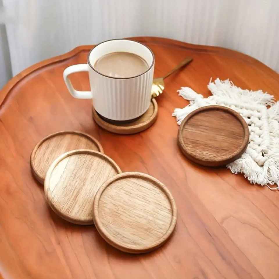 Ensemble de sous-verres durables en bois de manguier naturel avec support, écologiques, élégants et personnalisables, pour la décoration de la maison, du bureau ou de la table.
