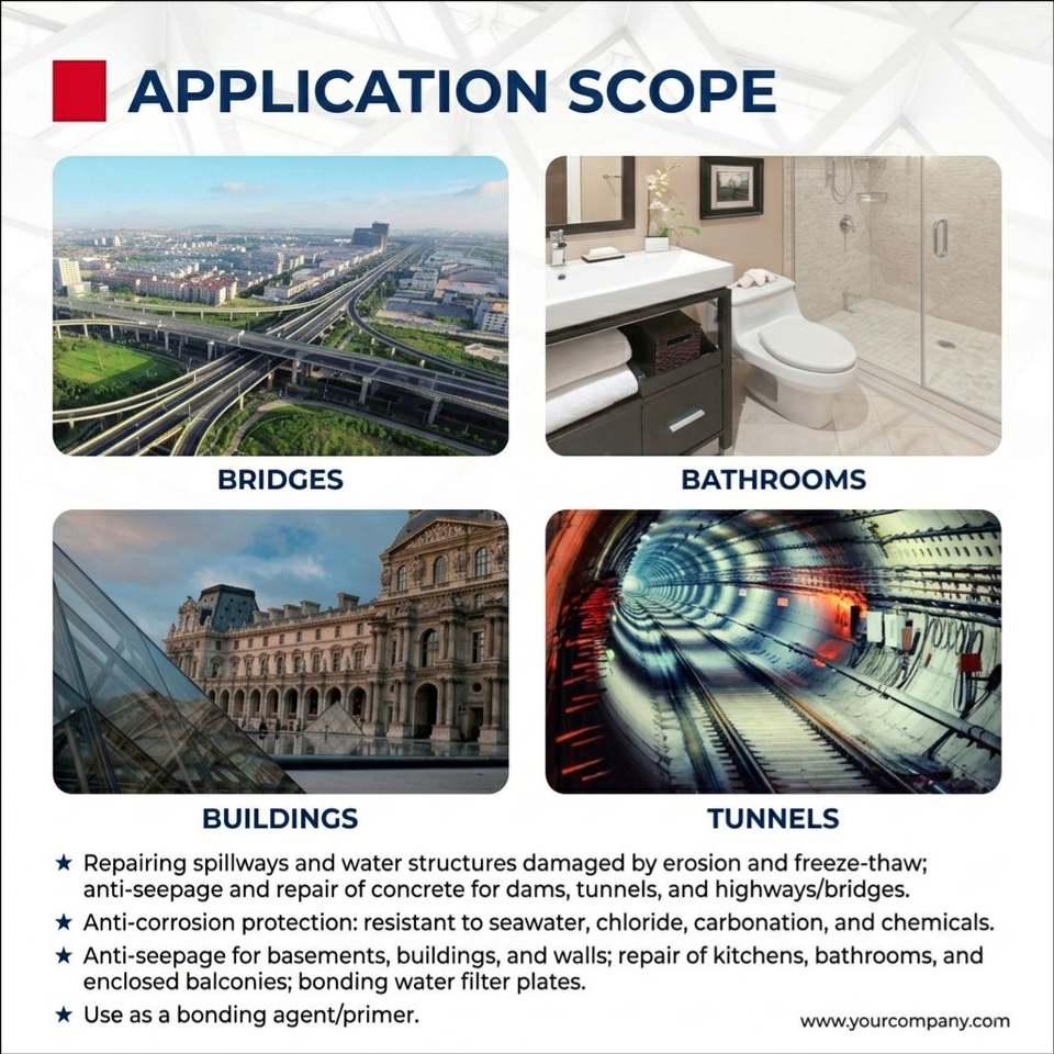 Sol, Piscine, Mur, Toit, Carreau, Villa, Hôtel, Appartement, Immeuble de bureaux, Hôpital, École, Center commercial, Sites sportifs, Installations de loisirs, Supermarché, Sous-sol Tunnel Salle de bain ToitApplication