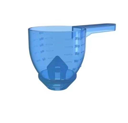 Gobelet doseur universel en plastique (transparent), avec trois becs verseurs pour un versement précis.