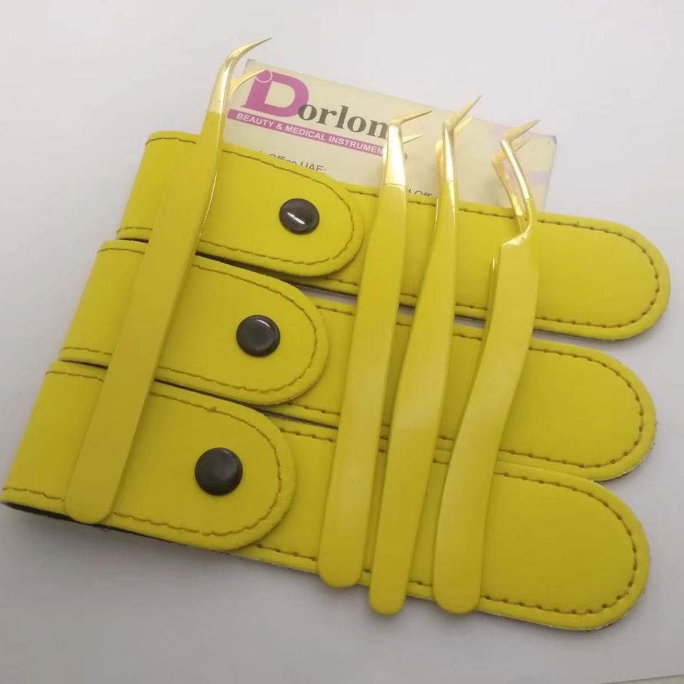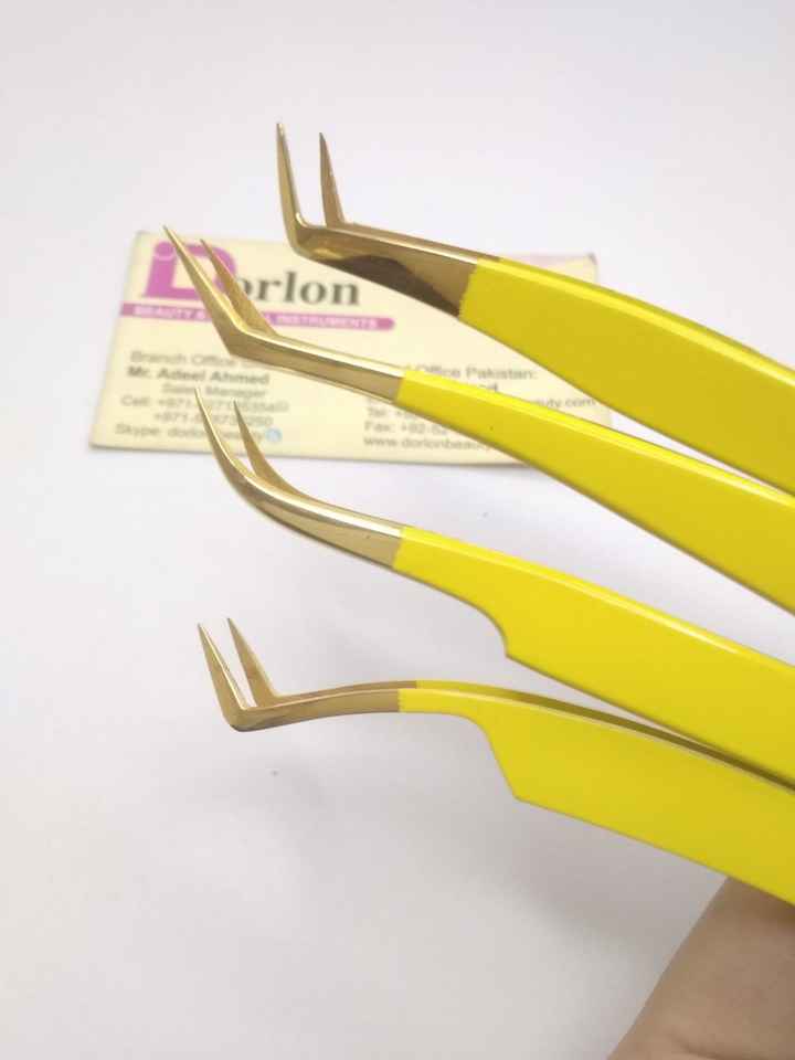Pince à cils en acier inoxydable semi-incurvée à 45 degrés avec logo personnalisé, couleur jaune de qualité durable avec pointes plaquées or