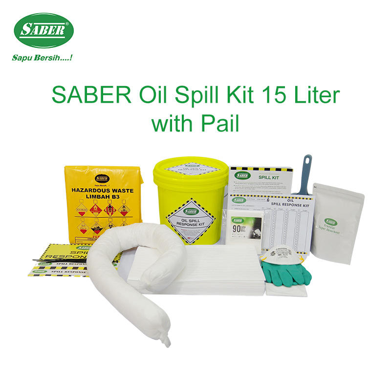 Kit anti-déversement d'huile SABER durable de 15 litres avec seau, kit de nettoyage d'urgence sélectif avec seau pour ateliers et fuites de machines