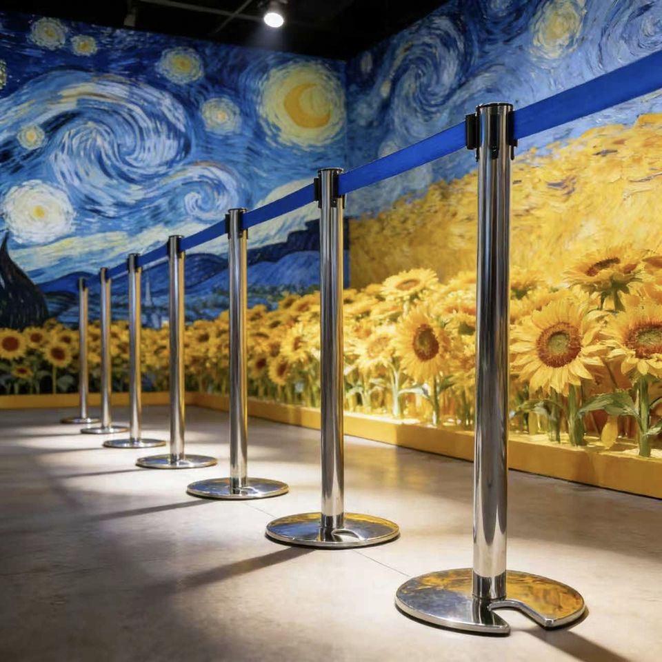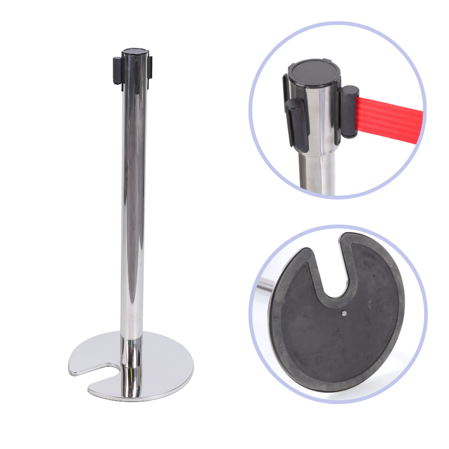 Poteau de contrôle de foule en acier inoxydable argenté durable avec base en fonte lestée et ceinture de 5 cm de large
