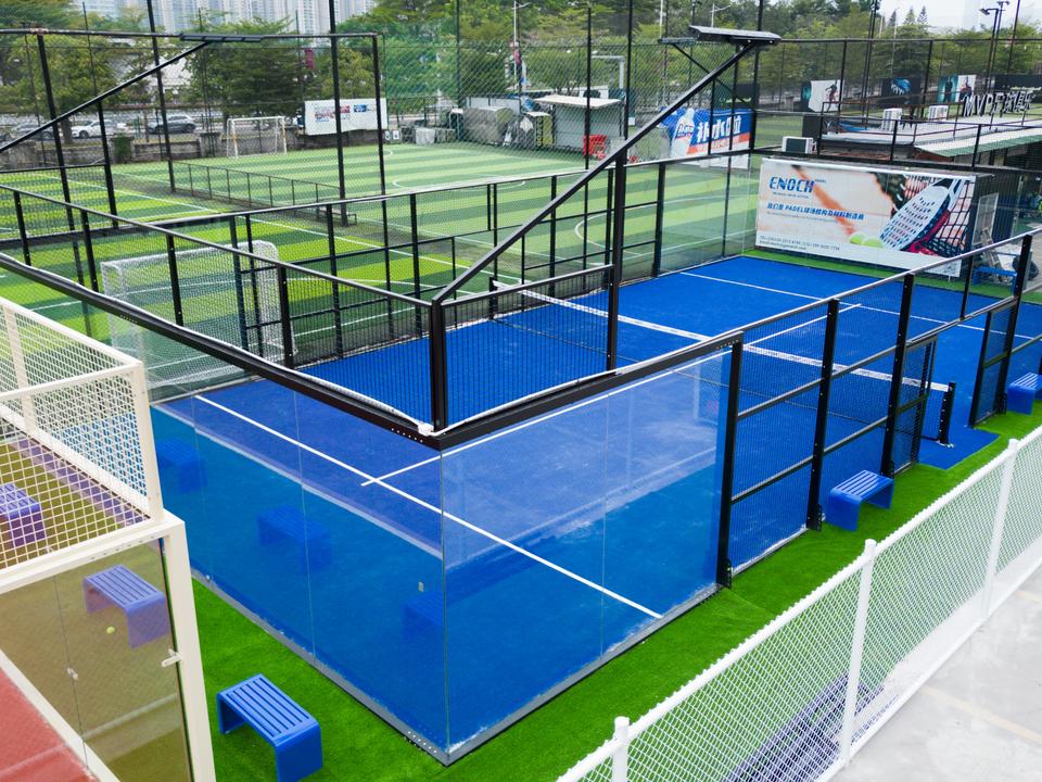 Terrain de padel en acier inoxydable durable, finition galvanisée à chaud, verre trempé, gazon artificiel, garantie 10 ans, sur mesure